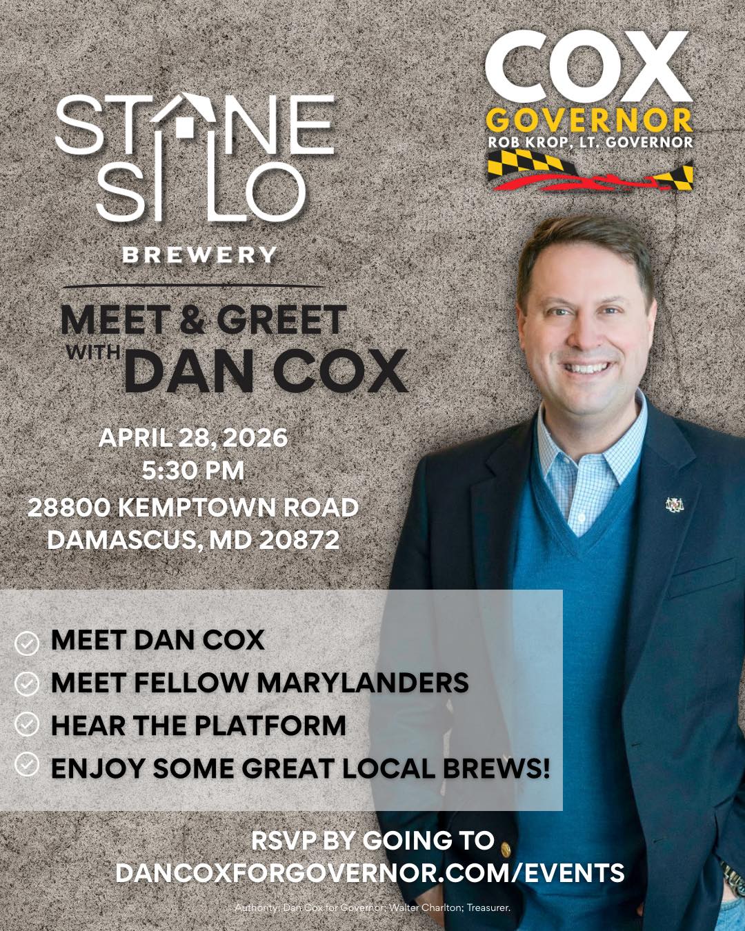 Join us for the Stone Silo Meet and Greet to hear Dan Cox's platform, meet fellow Marylanders, and enjoy some local brews!